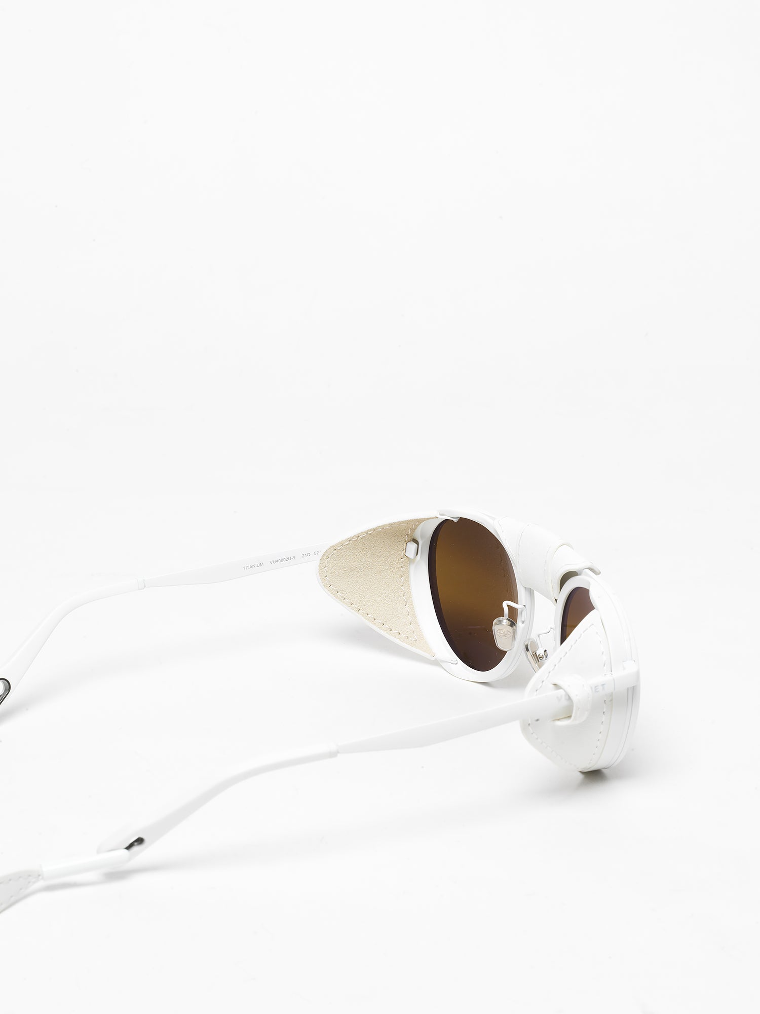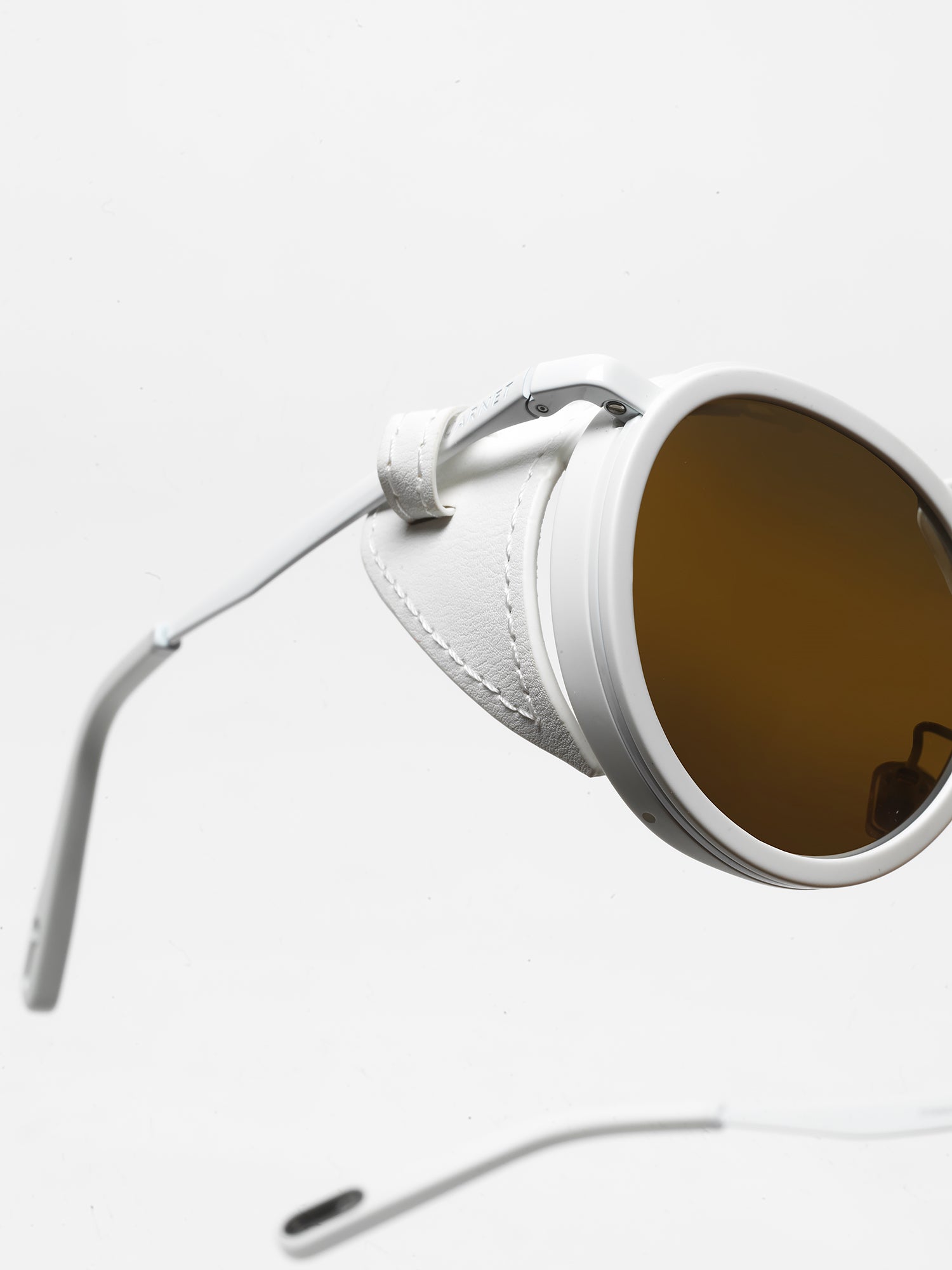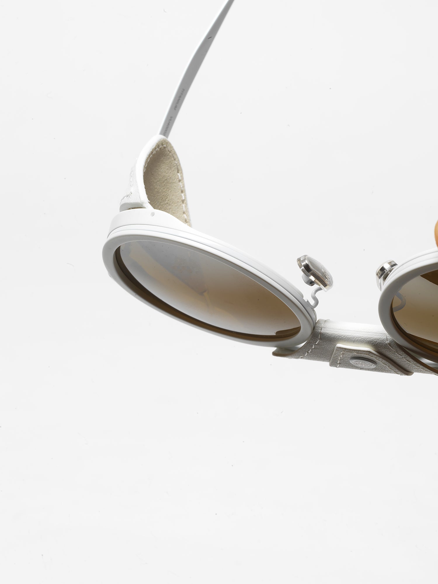 Vuarnet Glacier is a mountain icon. Featuring a round lens shape, removable side shields and nose bridge, the Glacier Round protects your eyes from intense sunlight conditions even on the highest peaks. The frame is made of titanium, beta-titanium and bio-acetate, and the accessories are crafted from leather. Mineral glass lenses provide the ultimate protection against intense alpine lighting conditions.