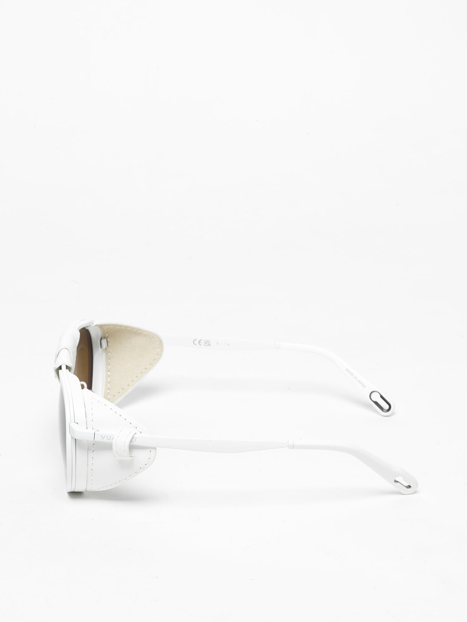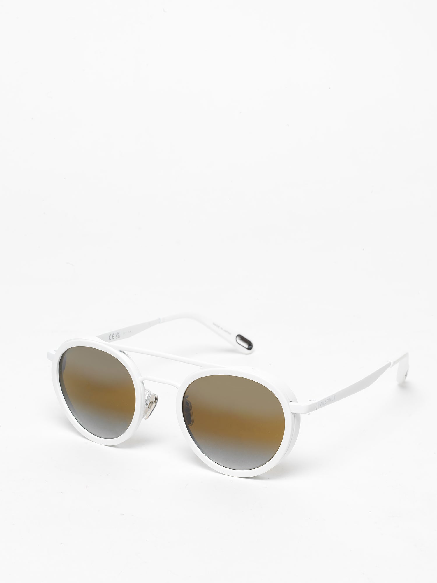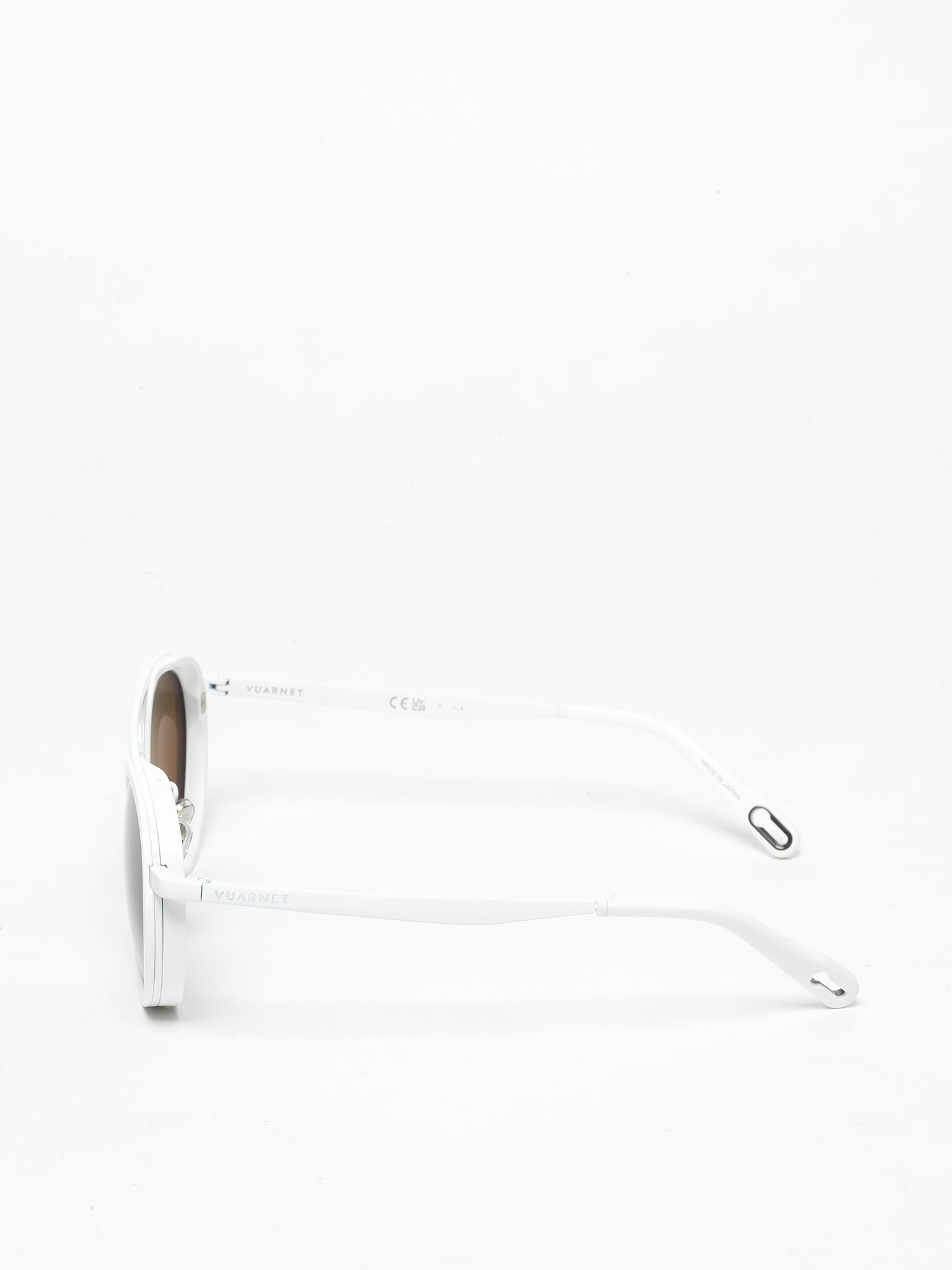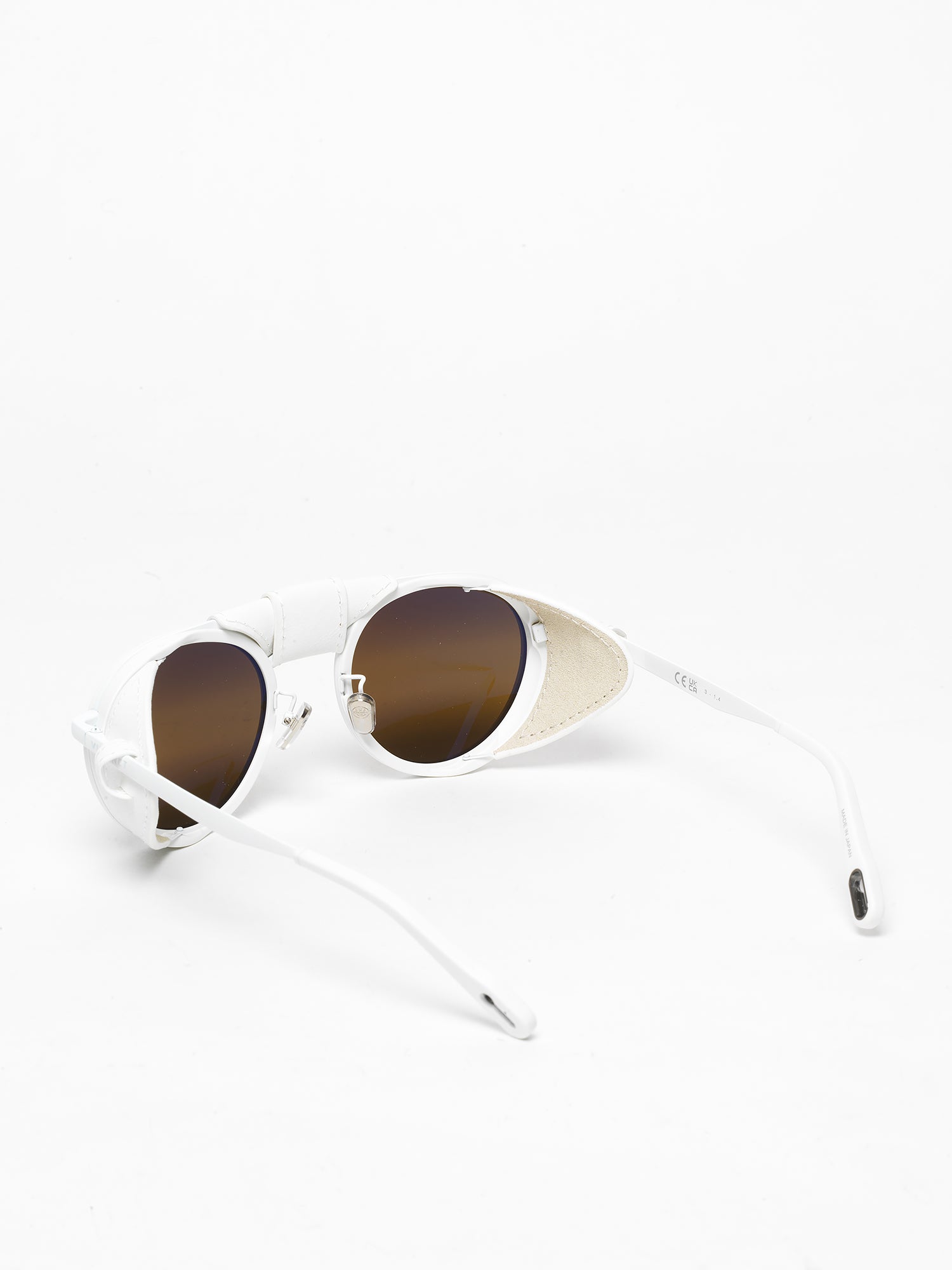 Vuarnet Glacier is a mountain icon. Featuring a round lens shape, removable side shields and nose bridge, the Glacier Round protects your eyes from intense sunlight conditions even on the highest peaks. The frame is made of titanium, beta-titanium and bio-acetate, and the accessories are crafted from leather. Mineral glass lenses provide the ultimate protection against intense alpine lighting conditions.